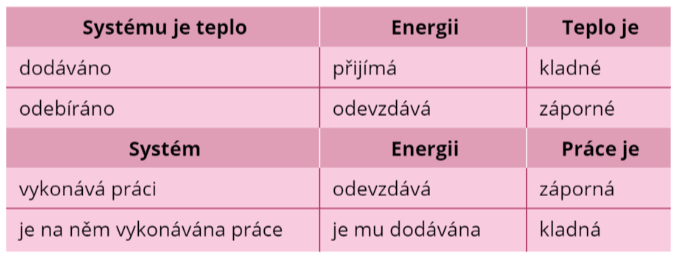 Energie se může mezi soustavami vyměňovat dvěma způsoby - ve formě práce (značí se W) nebo tepla (značí se Q). Práce se koná při pohybu proti nějaké síle, v případě tepla se jedná o energii spojenou s rozdílem teplot.