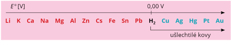 Vodík se standardním redoxním potenciálem rovným nule rozděluje kovy na redukční činidla (vlevo, záporné E^{\circ} ) a oxidační činidla (vpravo, kladné E^{\circ} ).