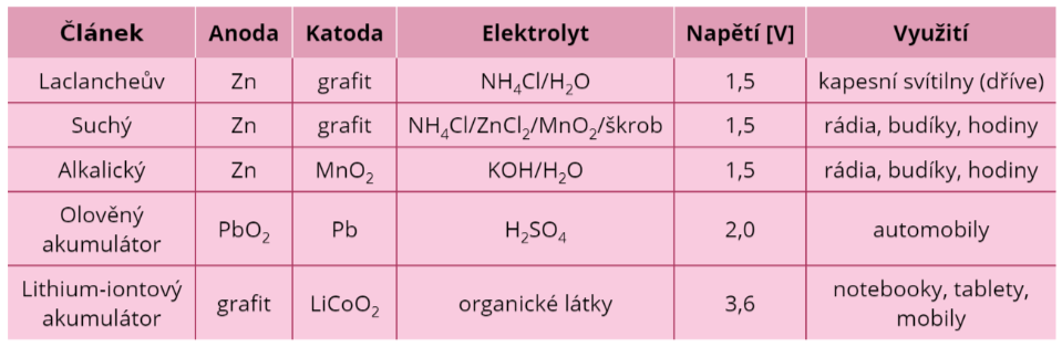 Složení a napětí některých článků je uvedeno v tabulce: