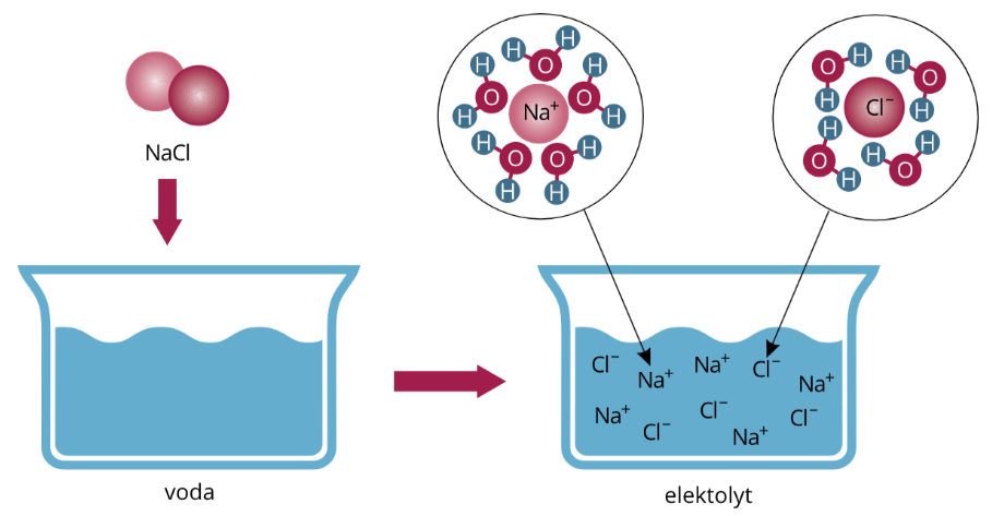 V prvé řadě je třeba si připomenout, co se děje s polárními látkami, když je rozpustíš ve vodě (nebo jiném polárním rozpouštědle). Polární látky disociují, tedy se rozkládají na kladně nabité kationty a záporně nabité anionty, kolem kterých se z molekul rozpouštědla vytvoří tzv. solvatační obal. Takto vzniklému roztoku se říká elektrolyt.