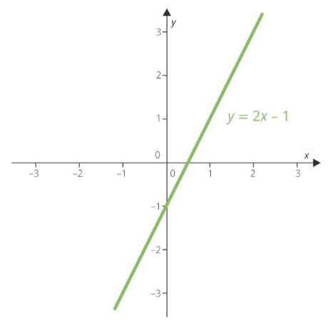 Příkladem může být v reálných číslech lineární funkce y=2 x-1, kde tedy a je 2 a b je -1 . Grafem této funkce, jak můžeš vidět na obrázku níže, je přímka. Je nakreslena v kartézské soustavě souřadnic, což je pouze odbornější název pro osy x a y, které můžeš vidět v grafu níže.
