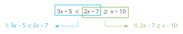 Soustava dvou lineárních nerovnic o jedné neznámé může vypadat na první pohled i jako jedna lineární nerovnice s tím rozdílem, že má v sobě dvě znaménka nerovnosti. Příkladem může být soustava nerovnic 3 x-5<2 x-7 \geq x-10. Jednoduše si tuto soustavu rozdělíš na dvě nerovnice. První bude 3 x-5<2 x-7 a druhá pak