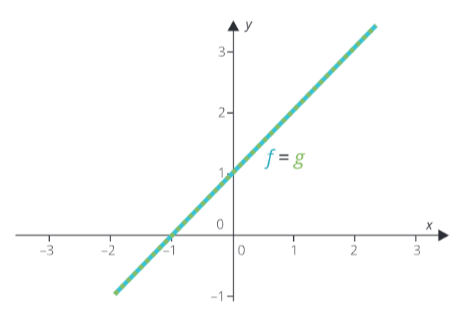 b) Nekonečně mnoho řešeníPokud v grafu budou obě funkce „v sobě“. To znamená, že jedna bude ležet v druhé (viz graf níže), pak existuje nekonečně mnoho průsečíků, což znamená, že soustava rovnic bude mít nekonečně mnoho uspořádaných dvojic.