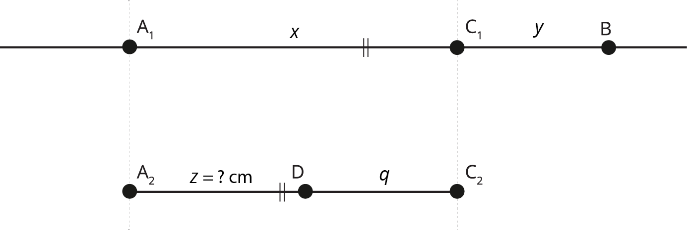 Vypočítej velikost \( z \), když víš, že \( x=5,5cm,\:y=2,5cm \) a \( q = 2,5 cm \).