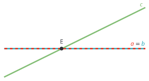 Stejně jak tomu bylo u bodu, přímky se také mohou navzájem překrývat. Pak se značí a=b. Lze je také označit jako splývající přímky (totožné přímky). Nebo se přímky mohou protnout a vytvoří tak průsečík dvou přímek, třeba bod \mathrm{E}.