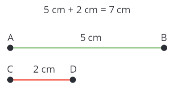 Když chceš znát velikost jejich součtu, tak jednoduše jejich velikosti sečteš. Výsledná úsečka AD bude mít velikost 7 \mathrm{~cm}.