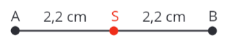 Hodnotu 4,4 tedy vydělíš dvěma. Výsledkem jsou 2,2 cm, což znamená, že střed úsečky (např. bod S) se nachází 2,2 cm od obou krajních bodů.