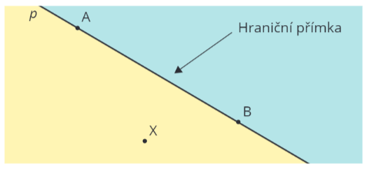 Přímka p (např. nekonečná runway na letišti) rozdělující rovinu se nazývá hraniční přímka a je společná pro obě poloroviny (přímka patří do obou polorovin). V polorovině se volí bod (např. místo, kde právě stojíš), který se nazývá pomocný bod. Ten ukazuje, jakým směrem polorovina od přímky leží.