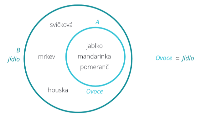 Například budeš mít dvě množiny (hromady). První množina se bude jmenovat Ovoce a druhá Jídlo. Množina Ovoce bude obsahovat prvky jako je pomeranč, mandarinka, jablko. Množina Jídlo bude obsahovat prvky svíčková, mrkev, houska, ale i pomeranč, mandarinka a jablko. Znamená to tedy, že množina Ovoce je podmnožinou množiny Jídlo (ovoce je podřazené slovo výrazu jídlo).