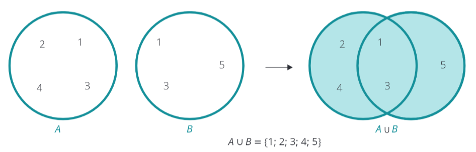 Sjednocením množin A a B vznikne nová množina, která bude obsahovat všechny prvky patřící alespoň (minimálně) do jedné z množin A nebo B.