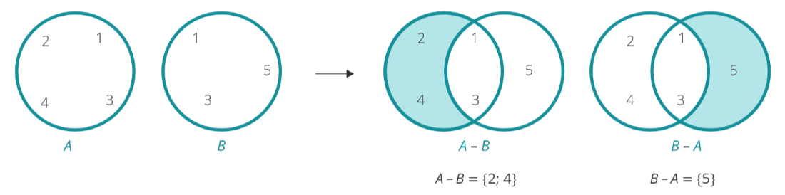 Například máš množinu A=\{1 ; 2 ; 3 ; 4\} a množinu B=\{1 ; 3 ; 5\}. Rozdílem A-B vznikne nová množina, obsahující čísla 2 a 4, protože tyto prvky jsou pouze v množině A. Čísla 1 a 3 jsou v obou množinách a číslo 5 je pouze v množině B. V případě rozdílu množin B-A bude výsledkem množina s prvky, které jsou pouze v množině B, tedy množina s prvkem 5.