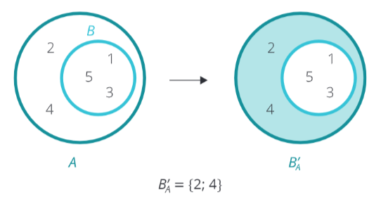 Například máme množinu A=\{1 ; 2 ; 3 ; 4 ; 5\} a množinu B=\{1 ; 3 ; 5\}. Doplňkem B \vee A je množina obsahující čísla 2 a 4, protože tato čísla jsou pouze v množině A. Čísla 1, 3 a 5 jsou v obou množinách zároveň.