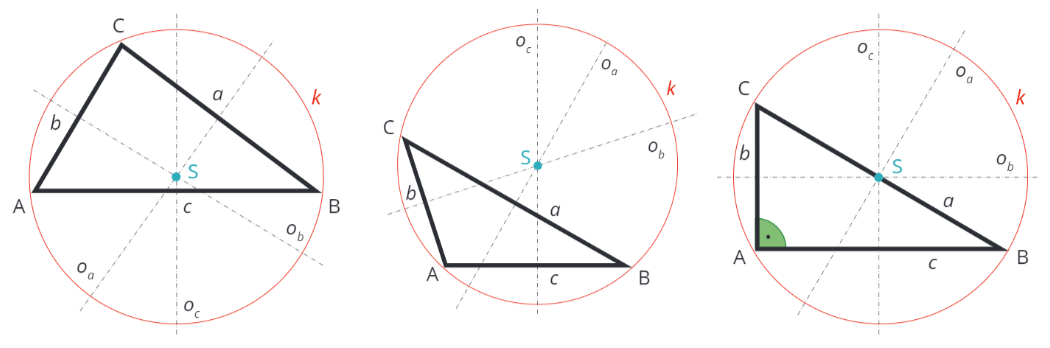 Kružnice opsaná je kružnice, která prochází všemi vrcholy trojúhelníku, doslova ho opisuje. K tomu, aby bylo možné takovou kružnici narýsovat, je potřeba umět sestrojit osy stran. Jakmile je sestrojíš, tak se všechny osy protnou v jednom bodě, který se obvykle značí jako S. Tento bod je zároveň středem kružnice opsané.