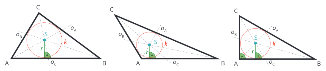 Kružnice vepsaná je taková, která se dotýká všech tří stran, má tedy s každou stranou společný právě jeden bod. U kružnice vepsané je potřeba umět sestrojit osy úhlů. Tam, kde se tyto osy protnou, vznikne střed kružnice vepsané, často se značí písmenem S. Poloměrem kružnice vepsané bude tedy kolmice na libovolnou stranu trojúhelníku.