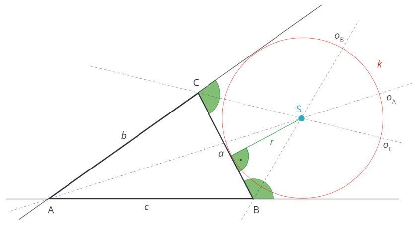 Můžeš si všimnout, že je potřeba protáhnout přímky, na kterých leží dvě zbývající strany trojúhelníku. Následně k vnějším úhlům sestrojíš jejich osy, také nesmíš zapomenout sestrojit osu úhlu, který se nachází naproti straně, které bude připsána kružnice. Tam, kde se všechny osy střetnou, vznikne střed kružnice připsané.