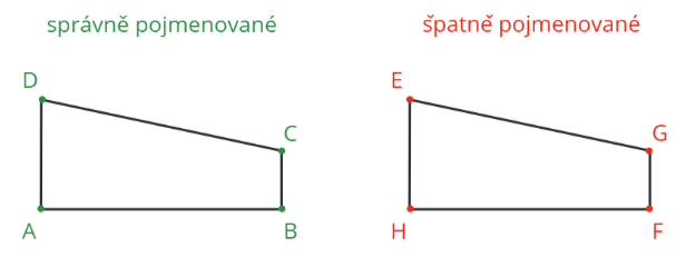 Na obrázcích výše můžeš vidět, jak správně pojmenovat čtyřúhelník. Vhodné je dodržovat posloupnost abecedy (viz špatné pojmenování HFGE).