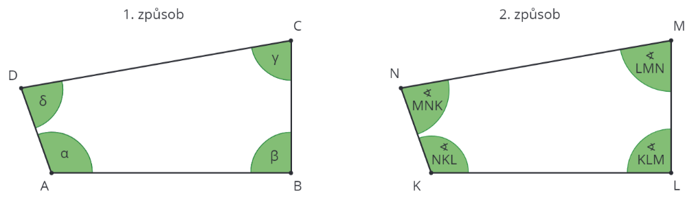 Vnitřní úhly se většinou zapisuji řeckými písmeny. Je samozřejmě na tobě, jaká písmena zvolíš, ale pro lepší přehlednost i zapamatování ti budou čtyři základní úhly stačit, tj. \alpha (alfa), \beta (beta), \gamma (gama) a \delta (delta). Úhel Ize například také pojmenovat pomocí symbolu „∢” a jednotlivých vrcholů čtyřúhelníku, kdy vrchol, u kterého se nachází úhel, je vždy uprostřed názvu úhlu. Součet všech úhlů ve čtyřúhelníku je vždy 360^{\circ}.