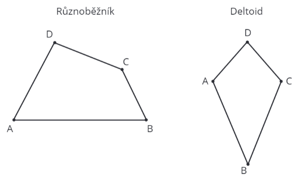 Různoběžník se vyznačuje tím, že žádné dvě z jeho stran nejsou rovnoběžné. Specifickým typem různoběžníku je deltoid. Tvar deltoidu připomíná papírového létacího draka. Úhlopříčky deltoidu jsou na sebe kolmé a delší (hlavní) úhlopříčka půlí kratší (vedlejší) úhlopříčku.