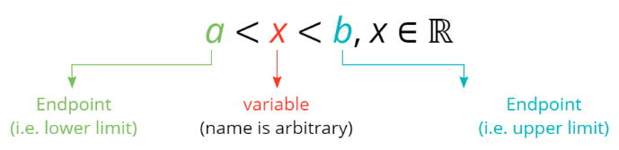 You can note down an interval in three ways. You will most often encounter the first way: it's typical interval notation, where two numbers are are in brackets divided by a semicolon (sometimes a comma is used, which may be misleading and may be confused with a decimal number, so we won't use it in this book).