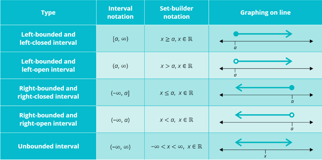 As mentioned at the beginning of the chapter, even infinite intervals can be further divided. You can find a summary of these infinite intervals in the chart below (where a is a real number). The same rules for graphing apply, i.e. a round bracket is noted by an open circle and a square bracked is a filled-in circle.