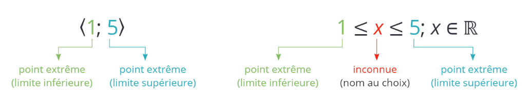 Tu inscriras l'intervalle \langle 1 ; 5\rangle à l'aide de sa qualité caractéristique comme 1 \leq x \leq 5 (lis: « le nombre x est supérieur ou égal à 1 et en même temps inférieur ou égal à 5 »). Dans les autres types d'intervalles, concentre-toi sur le symbole d'inégalité changeant (soit «<» et « \leq » ) lors de l'inscription par qualité caractéristique.