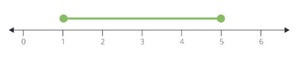 Tu peux inscrire ce type d'intervalle sur l'axe numérique. Tu représenteras les deux points extrêmes par un petit cercle plein, car ils font partie de l'intervalle, ce que disent les parenthèses aiguës: \langle 1 ; 5\rangle. Si les points ne faisaient pas partie de l'intervalle, c'est-à-dire si des parenthèses rondes étaient aux points extrêmes alors on les inscrirait sur l'axe numérique par des cercles vides, mais cela, j'y reviendrai.