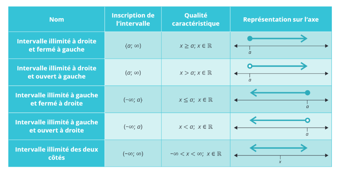 Comme je te l'ai déjà dit au début du sous-chapitre, les intervalles illimités peuvent aussi se diviser. Dans le tableau ci-dessous (où a est un nombre réel), tu trouveras l'aperçu de ces intervalles illimités. Les règles de traçage, par exemple le fait que la parenthèse ronde s'inscrit comme un cercle vide et la parenthèse aiguë comme un cercle plein, sont également valables ici.
