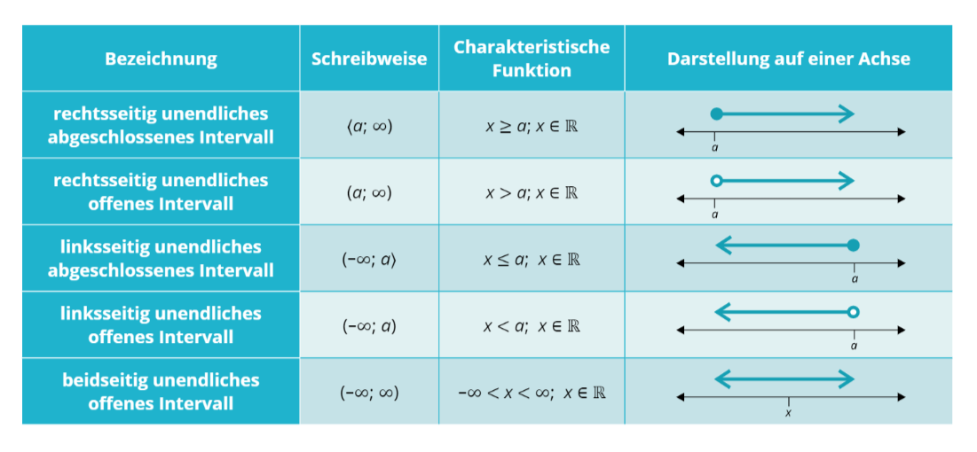 Wie ich dir schon am Anfang des Kapitels gesagt hab, kann man unbeschränkte Intervalle weiter aufteilen. In der unteren Tabelle (wo a eine reelle Zahl ist) kannst du eine Übersicht der unbeschränkten Intervalle finden. Die Regeln der Darstellung auf einer Zahlengeraden, wie z.B.: eine runde Klammer wird mit einem leerem Kreis dargestellt oder, dass eine spitze Klammer mit einem ausgefülltem Kreis dargestellt wird, gelten auch hier.