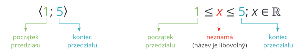 Przedział \langle 1 ; 5\rangle w postaci nierówności wygląda tak 1 \leq x \leq 5 (czytaj: „x jest większe lub równe jeden, ale mniejsze lub równe pięć”). Przy opisie kolejnych przedziałów ograniczonych skup się na zmieniającym się znaku nierówności („<” i „\le”).