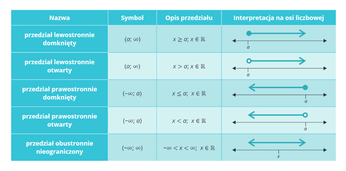 Jak już wspomniałem na początku rozdziału, przedziały nieograniczone można dzielić dalej. W tabelce poniżej (gdzie a to liczba rzeczywista) możesz zobaczyć charakterystykę przedziałów nieograniczonych. Zasada, którą stosowaliśmy wcześniej, że okrągły nawias = puste kółeczko, a kwadratowy = zamalowane kółeczko obowiązuje i tutaj.