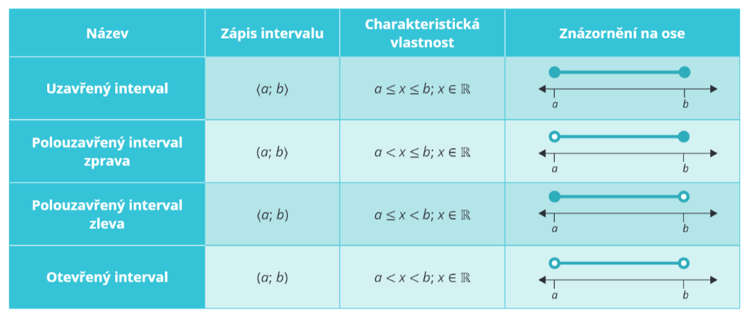 V následující tabulce (kde a, b jsou reálná čísla a platí, že a<b) se nachází přehled omezených intervalů. Pokud ti některý z těchto typů není jasný nebo nevíš, jak správně interval znázornit na ose nebo ho zapsat charakteristickou vlastností, podívej se na následující řádky pod tabulkou, kde ti toto vysvětlím detailněji. V případě, že ti to jasné je, můžeš přelistovat na stranu 92, kde se nachází přehled neomezených intervalů.
