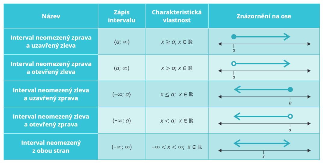 Jak jsem ti již říkal na začátku podkapitoly, i intervaly neomezené Ize dále dělit. V tabulce níže (kde a je reálné číslo) můžeš nalézt přehled těchto neomezených intervalů. Pravidla pro zakreslování, jako například, že kulatá závorka se značí prázdným kolečkem nebo že ostrá závorka je plné kolečko, platí i zde.