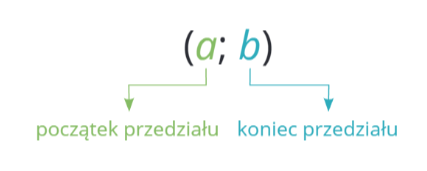 Pierwszy sposób zapisu wygląda następująco, początek i koniec przedziału zapisujemy w nawiasach. Liczba z lewej strony musi być mniejsza od tej po prawej, np. przedział (1 ; 5) jest zapisany dobrze, ale przedział (5 ; 1) już nie.