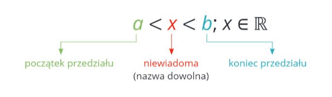 Drugi sposób zapisu to zapis w postaci nierówności, przede wszystkim stosuje się tę formę olo zapisu zbiorów liczbowych. Działa to tak, że najpierw piszesz mniejszą liczbę, następnie znak nierówności („\leq” jeżeli punkt należy do przedziału albo „<” \rightarrow jeżeli nie należy). Dalej niewiadomą (zależy od ciebie, jak ją nazwiesz, ale najczęściej jest to x) i kolejny znak nierówności (ponownie znak „\leq” lub „<“, w zależności od tego, czy dany punkt należy do przedziału czy też nie). Na końcu piszesz większą liczbę. Zapis 1<x<5 czyta się tak: „x jest większe od jeden, ale mniejsze od pięć”.